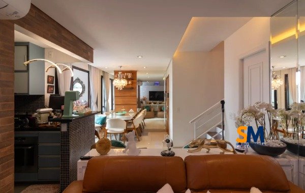 Sala de estar em dois ambientes com terraço todo fechado com vidro
